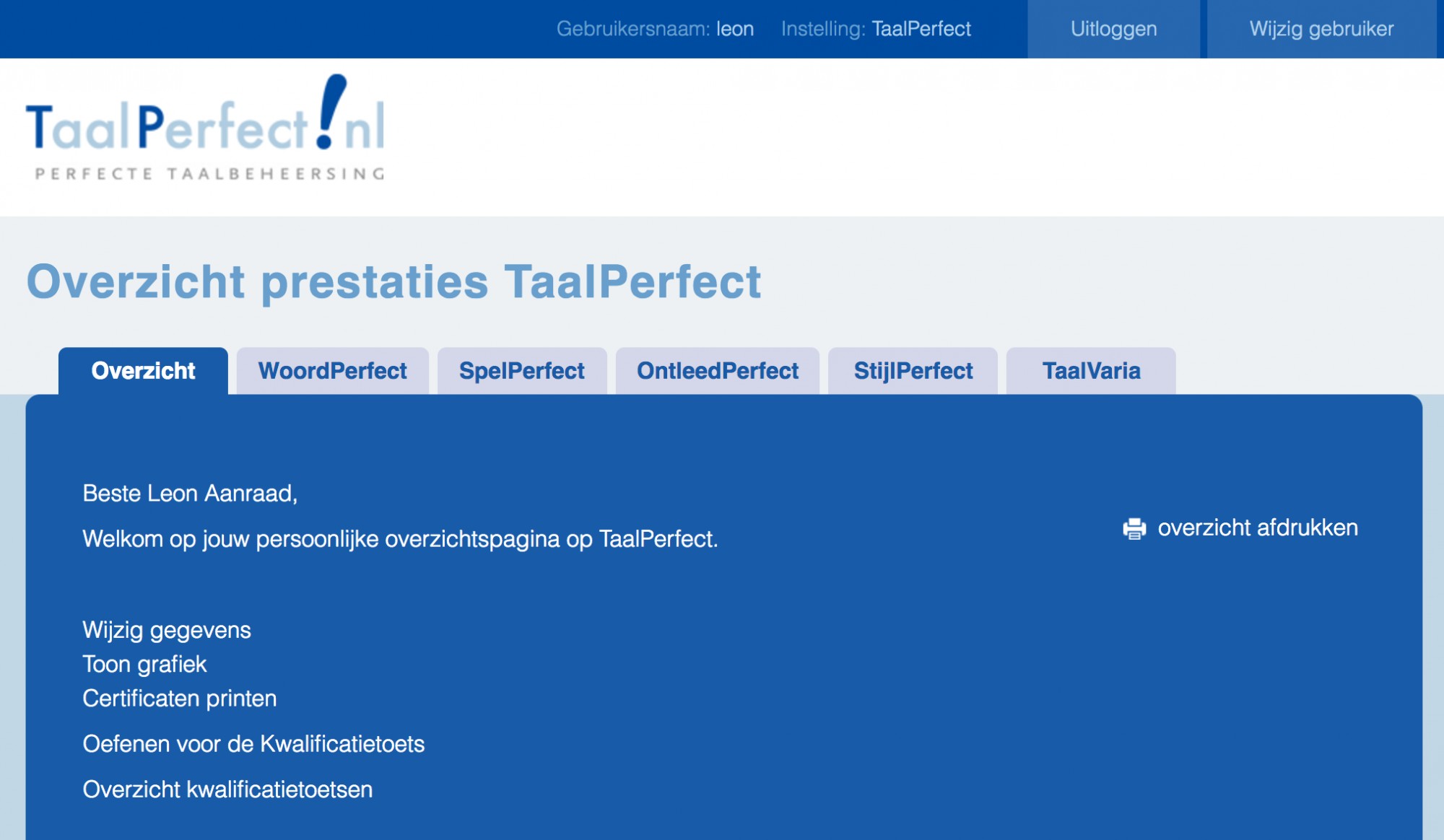 Door op het tabblad van het gewenste TaalPerfect-onderdeel te klikken, krijgt de kandidaat de bijbehorende oefeningen te zien. Bij wijze van voorbeeld tonen we het tabblad SpelPerfect.