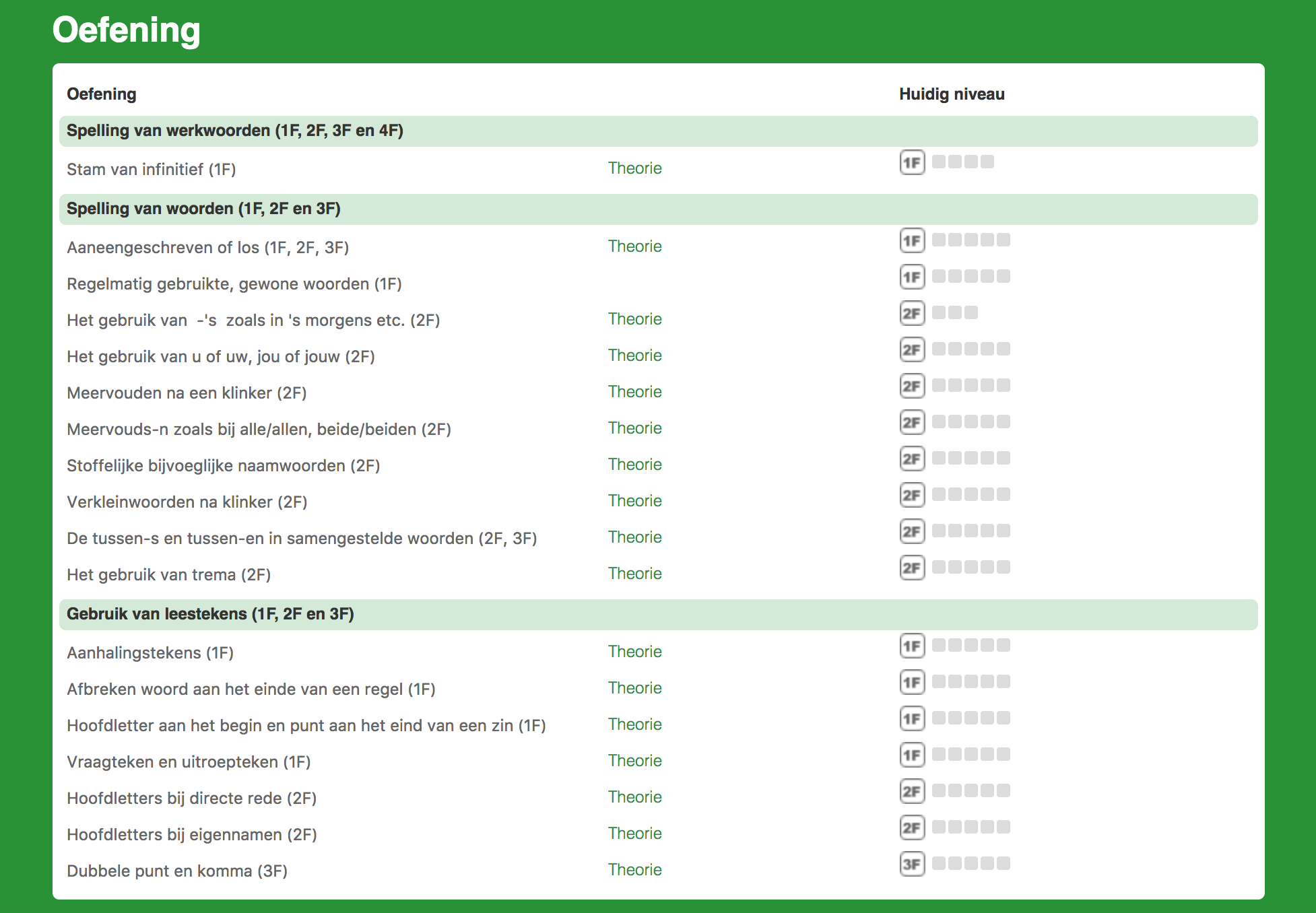 In de linkerhelft staan alle oefeningen vermeld. Door op de tekst 'Theorie' achter een oefening te klikken, verschijnt er een pagina met uitleg. In de rechterhelft staan de Meijerink-niveaus van de oefeningen aangegeven en daarachter de grijsgekleurde bolletjes die de kandidaat groen moet laten kleuren door de oefening telkens met een voldoende resultaat af te sluiten.
