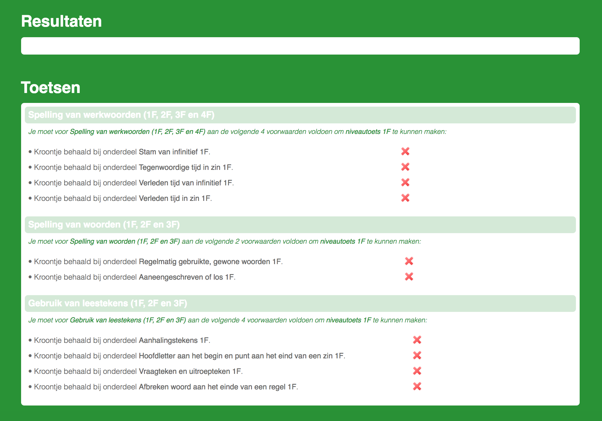Wat verder op deze schermpagina staat informatie over de Resultaten die de kandidaat het laatst heeft behaald en de voorwaarden die gelden voor de Niveautoetsen.