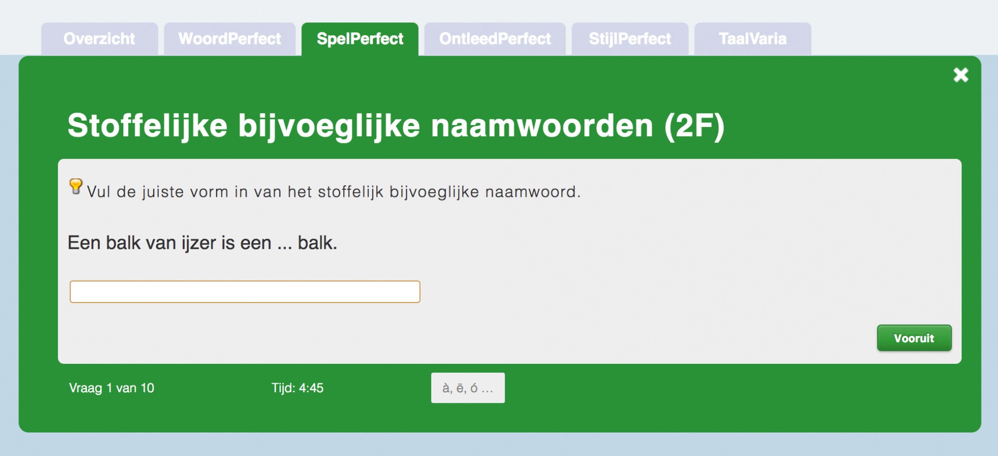 Hieronder ziet u bij wijze van voorbeeld het tabblad SpelPerfect actief en daarin de eerste opdracht van de oefening ‘Stoffelijke bijvoeglijke naamwoorden (2F)'.